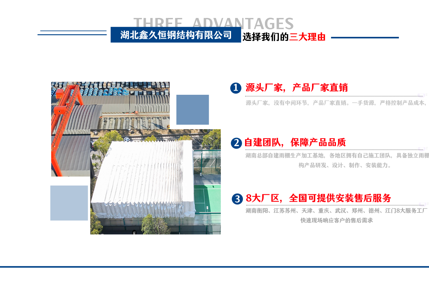 湖北鑫久恒鋼結(jié)構(gòu)有限公司是一家電動(dòng)雨棚、膜結(jié)構(gòu)車棚研發(fā),生產(chǎn)銷售,施工安裝于一體的專業(yè)鋼結(jié)構(gòu)科技公司,主要產(chǎn)品有伸縮雨棚,電動(dòng)雨棚,膜結(jié)構(gòu)車棚等。 湖南地區(qū)職員目前有80多人,占地面積20000平方米,廠房面積15600平方米,配備先進(jìn)的生產(chǎn)流水線,使每件品質(zhì)產(chǎn)品的堅(jiān)實(shí)基礎(chǔ)。 公司在蘇州、天津、重慶、武漢、德州、烏魯木齊、江門(mén)均設(shè)有服務(wù)工廠,總?cè)藛T共300多人,擁有專業(yè)的技術(shù)團(tuán)隊(duì),配備先進(jìn)的設(shè)備和流水線生產(chǎn),產(chǎn)能高,貨源充足,發(fā)貨速度快,服務(wù)區(qū)域廣。 移動(dòng)伸縮棚適用于通道臨時(shí)倉(cāng)儲(chǔ)、戶外運(yùn)動(dòng)遮陽(yáng)、污水池遮蓋、能源交通、熱力化工、礦山、船舶制造及市政建設(shè)、物流、碼頭等領(lǐng)域的構(gòu)件制作加工,成品半成品存放、倉(cāng)庫(kù)、野外儀器設(shè)備操作用房等。尤其是對(duì)工廠發(fā)貨、倉(cāng)儲(chǔ)臨時(shí)遮雨防嗮,梅雨期較長(zhǎng)、建設(shè)周期較短的工程施工等特別適用。還可根據(jù)用戶需求量身定制、適合企業(yè)所需不同款式的產(chǎn)品。 我公司堅(jiān)持“誠(chéng)信社會(huì)為本,客戶滿意為榮”的經(jīng)營(yíng)理念,做到質(zhì)量把控,嚴(yán)格管理,精益求精,恪守承諾。使鑫久恒逐步走向成熟,其系統(tǒng)化、專業(yè)化日趨完善。以專業(yè)的技術(shù)、科學(xué)的管理,更高的產(chǎn)品質(zhì)量,優(yōu)良的企業(yè)信譽(yù),真誠(chéng)的客戶服務(wù),靈活多樣的經(jīng)營(yíng)方式和務(wù)實(shí)創(chuàng)新的企業(yè)精神愿與社會(huì)各界攜手合作,為推動(dòng)智能鋼結(jié)構(gòu)建筑事業(yè)的發(fā)展而不斷努力。...